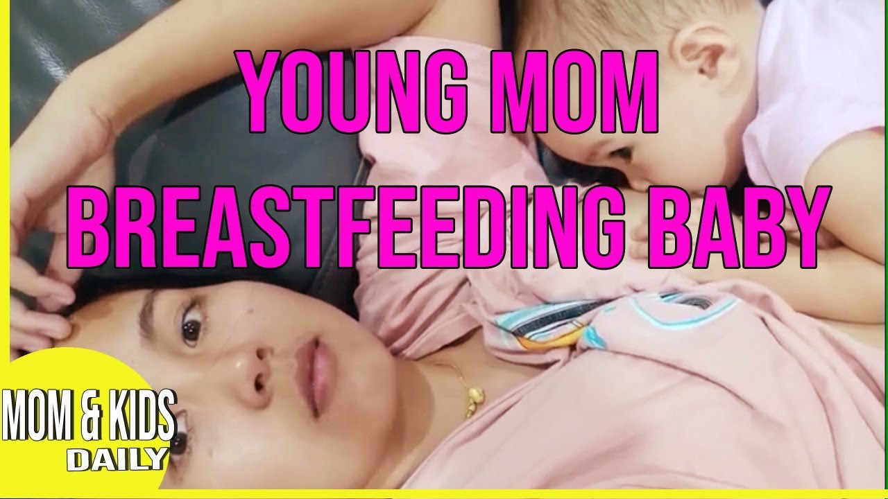 BEAUTIFUL YOUNG MOM BREASTFEEDING BABY ON THE BED